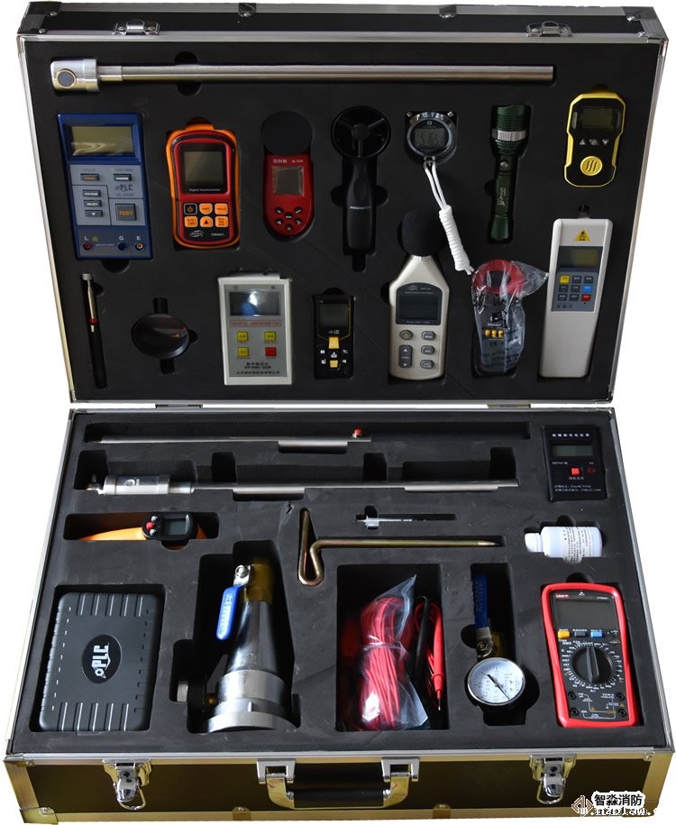 配置:不锈钢感烟探测器功能试验器1个,不锈钢感温探测器功能试验器1个,不锈钢火焰探测器功能试验器1个,线型光束感烟探测器滤光片1套(包含两片滤光片,一个手持杆及说明书合格证),消火栓测压接头1套, 喷水末端试水接头1套, 不锈钢秒表1个,数显测力计1台,强光手电1个,激光测距仪1台,数字照度计1台,数字声级计1台,数字风速计 1台,数字微压计 1台,数字温湿度计 1台,数字坡度仪 1台,接地电阻测量仪 1台,绝缘电阻测量仪 1台,数字万用表 1台,漏电电流检测仪 1台, 便携式可燃气体检测仪 1台,加长杆3根,电池1根,注入器一个,扳手1个,充电器,表针。